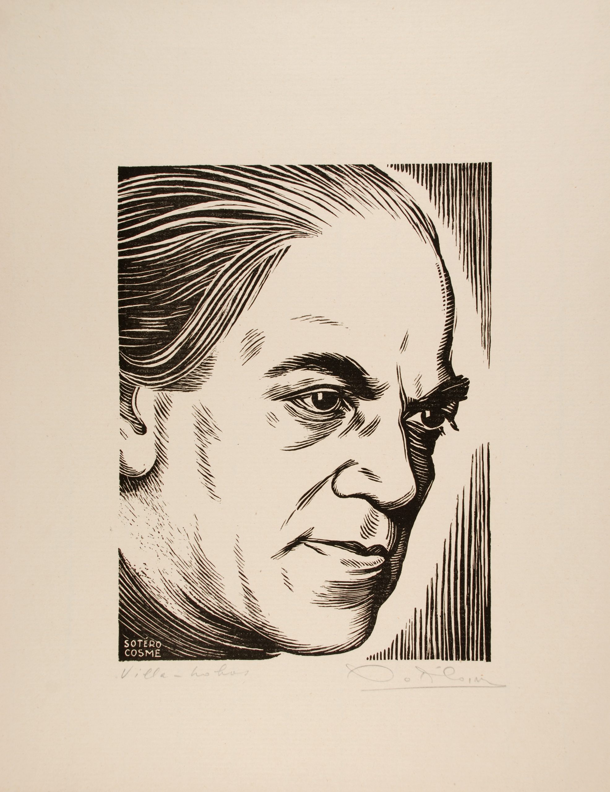 Estampa de Villa-lobos em preto e branco, de perfil à 3/4 para a direita. Cabelos para trás, sobrancelhas ressaltadas. No canto inferior esquerdo, nome do autor Sotero Cosme. Na margem inferior esquerda, abaixo da gravura, a inscrição, em escrita livre "Villa-Lobos" e à direita a assinatura do autor "Sotero Cosme" a lápis (Villa Info)