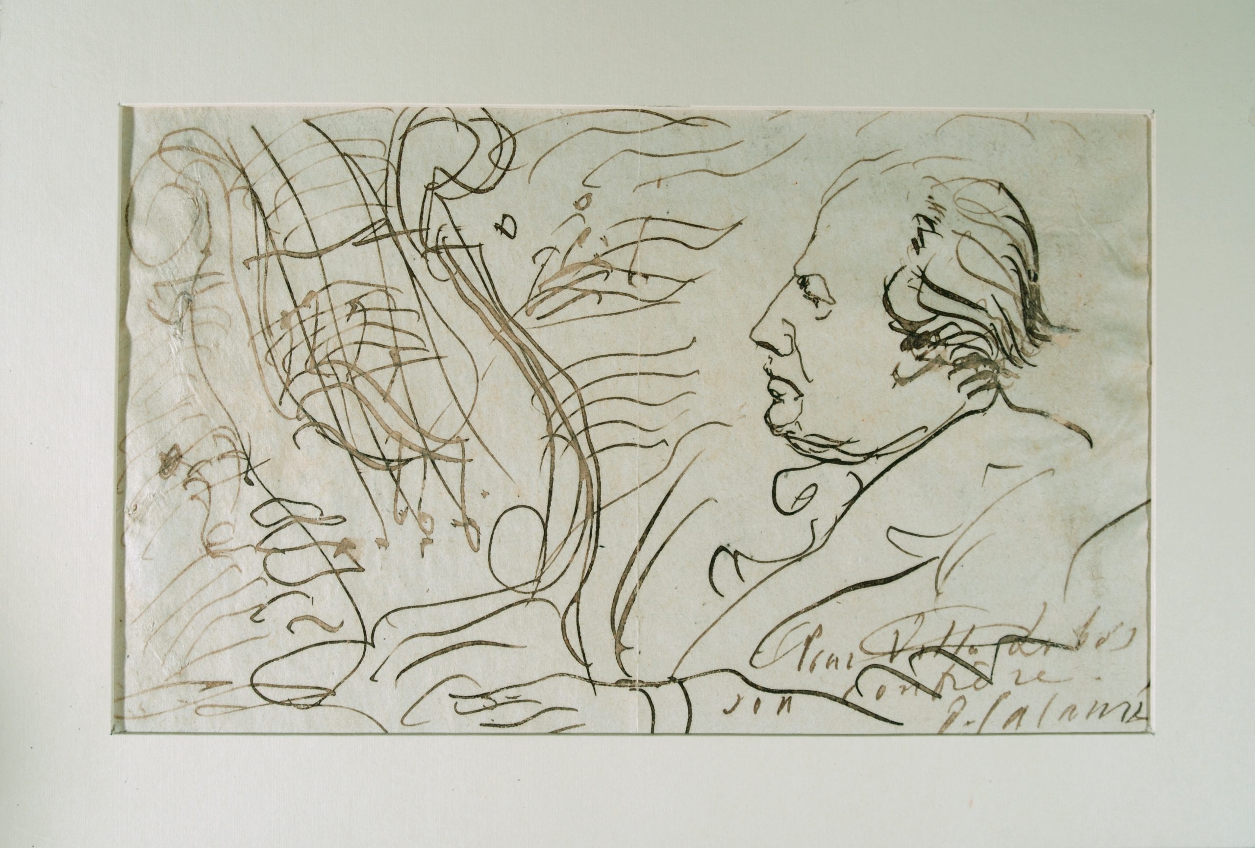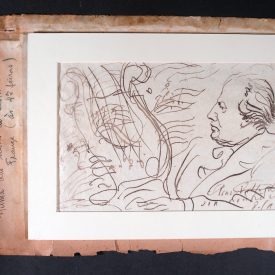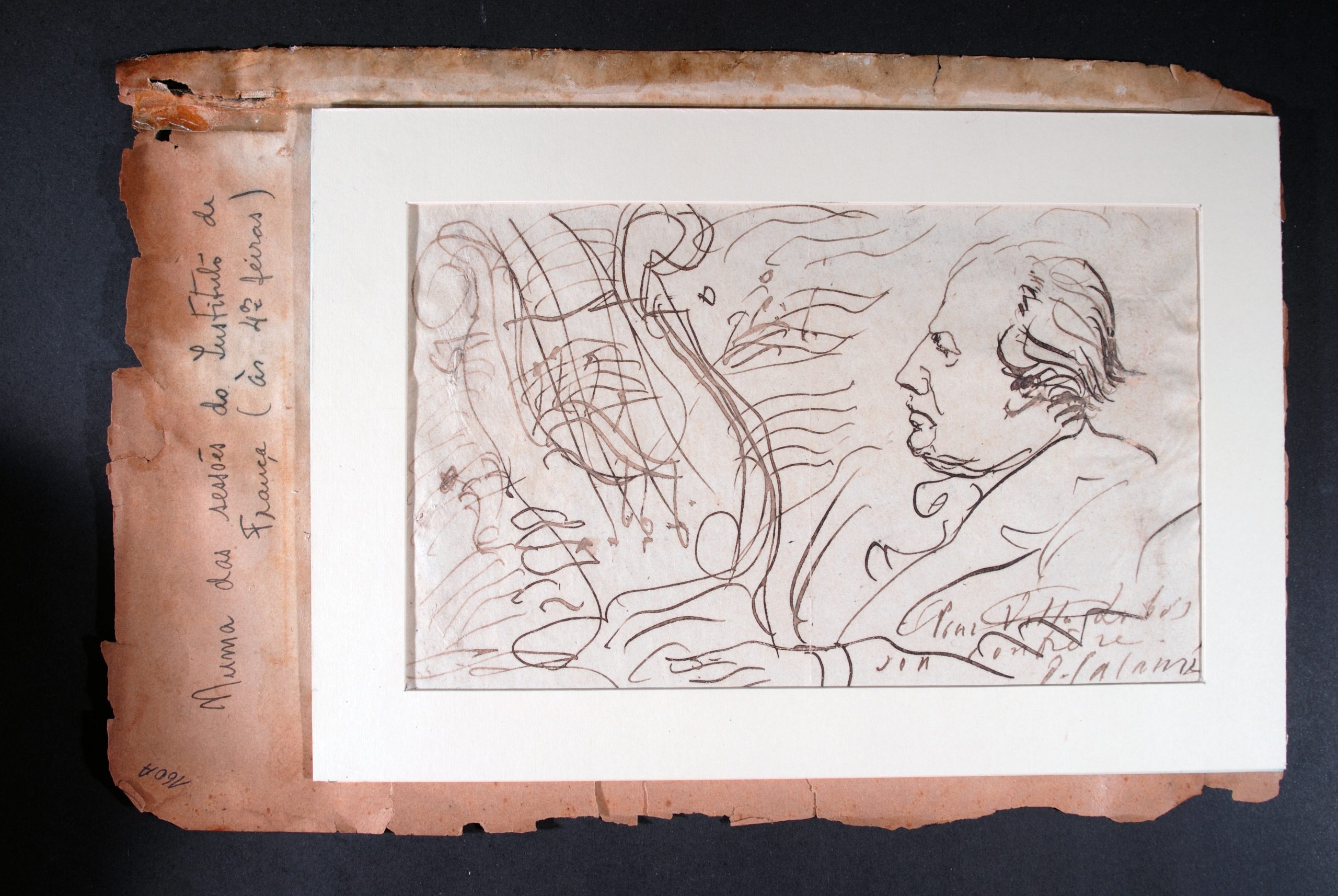 Desenho de Heitor Villa-Lobos de perfil à esquerda, em preto e branco. Traja paletó e aparenta estar tocando piano, de onde saem, à esquerda, rabiscos parecendo notas e pautas musicais embaralhadas. No canto inferior direito, assinatura do autor, ilegível. Do lado direito, escrito na vertical: "Numa das sessões do Instituto de França (às 4ªs feiras)" (Villa Info) Retirado do Livro de Recortes nº 50 pag. 160A (Planilha de inventário 2017)