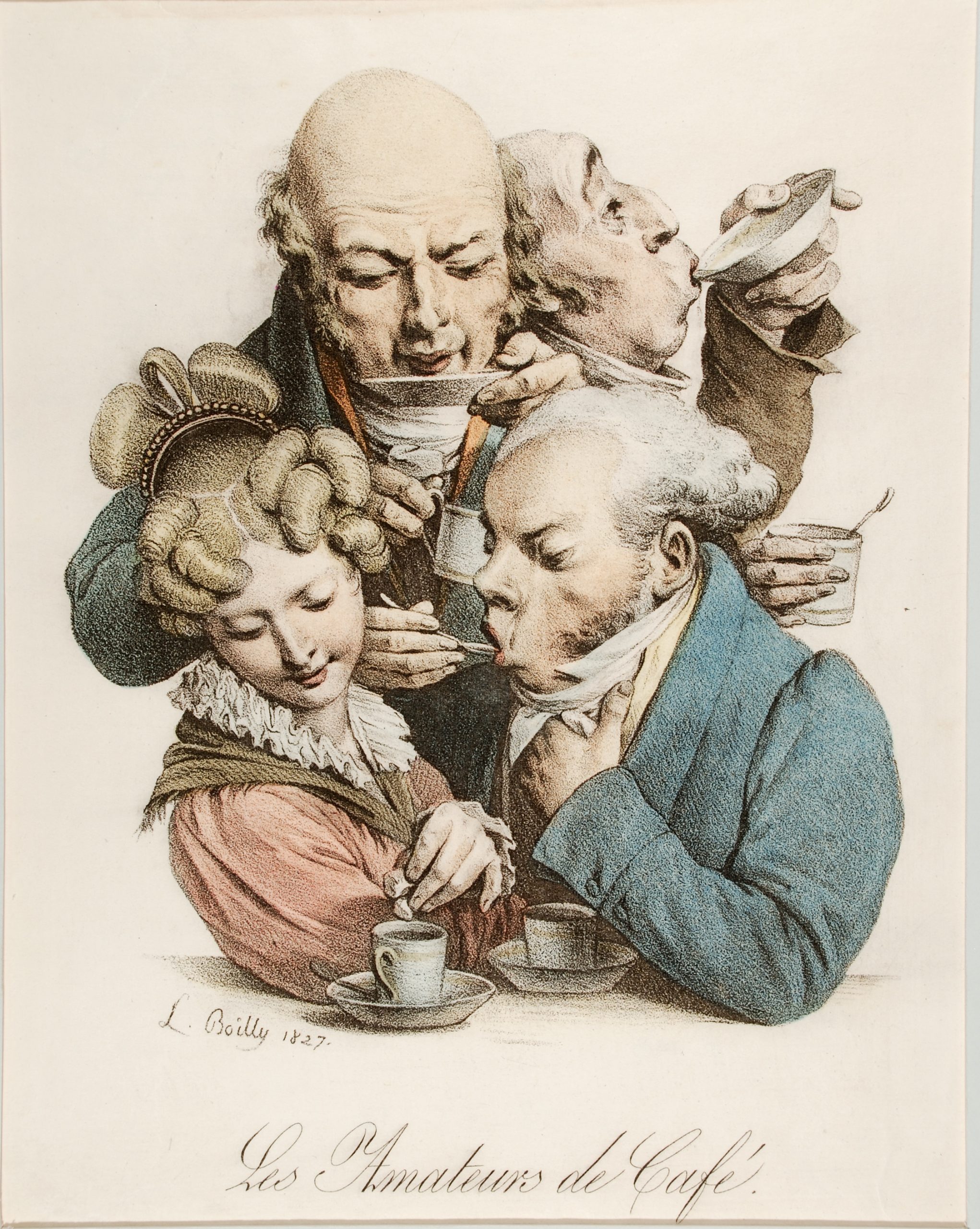 Gravura nos tons azul, rosa, amarelo, verde e marrom. Em primeiro plano, sentados, homem e mulher. Ele trajando terno azul com colete amarelo e gravata branca tipo laço no pescoço. Mão esquerda no peito, mão direita levando colher à boca. À sua frente, na mesa, xícara com píres. À esquerda, também sentada, mulher com vestido no tom rosa, tendo xale esverdeado no pescoço e sobressaindo do vestido, gola branca plissada. Rosto à 3/4, cabelos com franjas enroladas, tiara e arranjo aparente na parte de trás. Coloca pedras de açúcar, com a mão esquerda, na xícara de café, com pires, à sua frente, na mesa. Atrás, em pé, dois homens, um de frente, com terno em tom esverdeado, colete vermelho, gravata branca em forma de laço. Leva pires à boca com a mão esquerda e segura xícara com a mão direita. Na margem abaixo, assinatura do artista: "L. Boilly, 1827". Na margem próxima ao passpartout, o título: "Les Amateurs de Café"