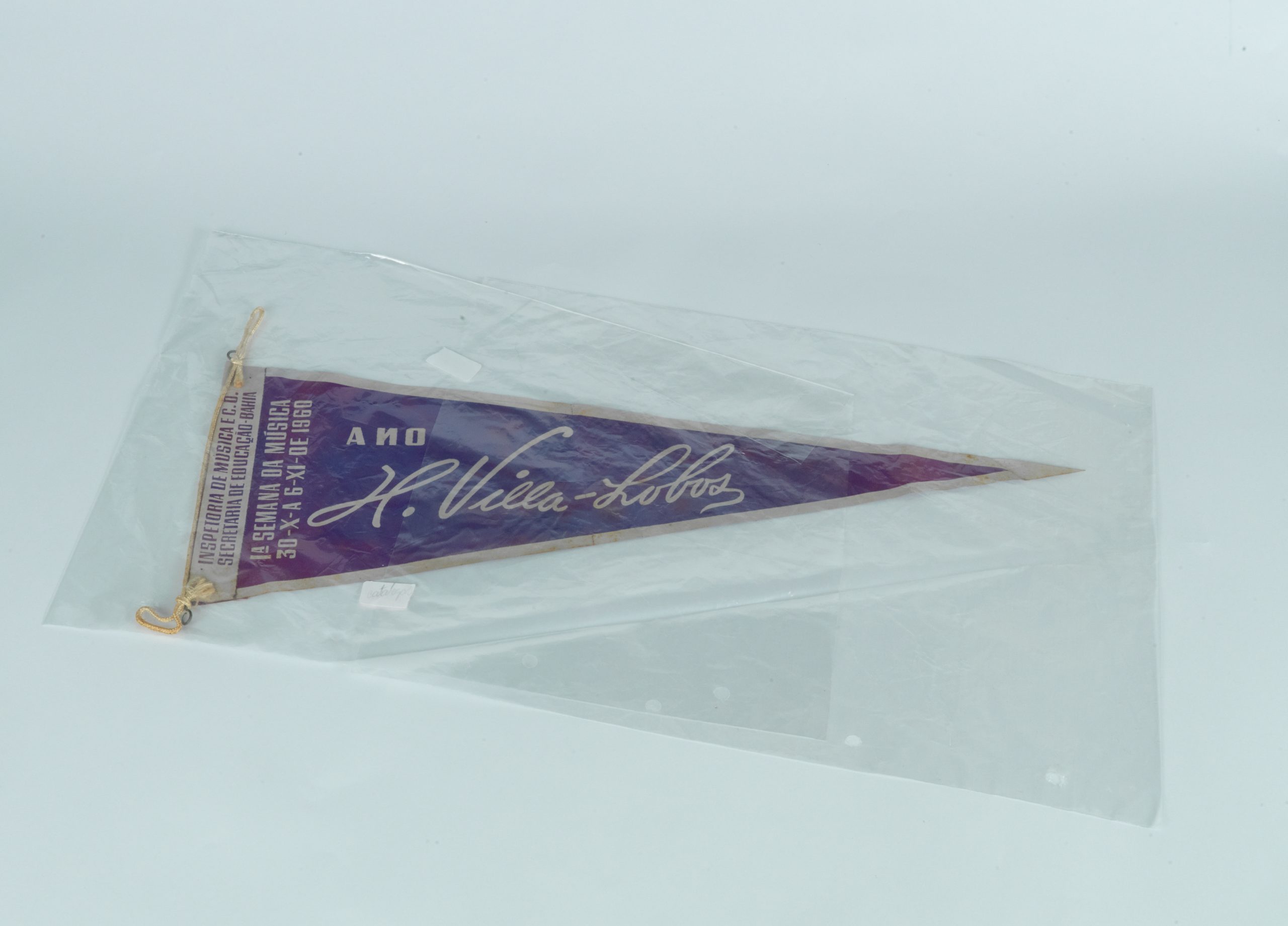 Flâmula em fundo preto com margens brancas, inscrições no topo da flâmula na vertical ("Inspetoria de música EC.O. Secretaria de Educação - Bahia" - "1ª Semana da Música 30 - X- A 6-X de 1960") e inscrições ao longo da flâmula (assinatura de H, Villa-Lobos). Ano Villa-Lobos. 30/10 a 06/11/1960