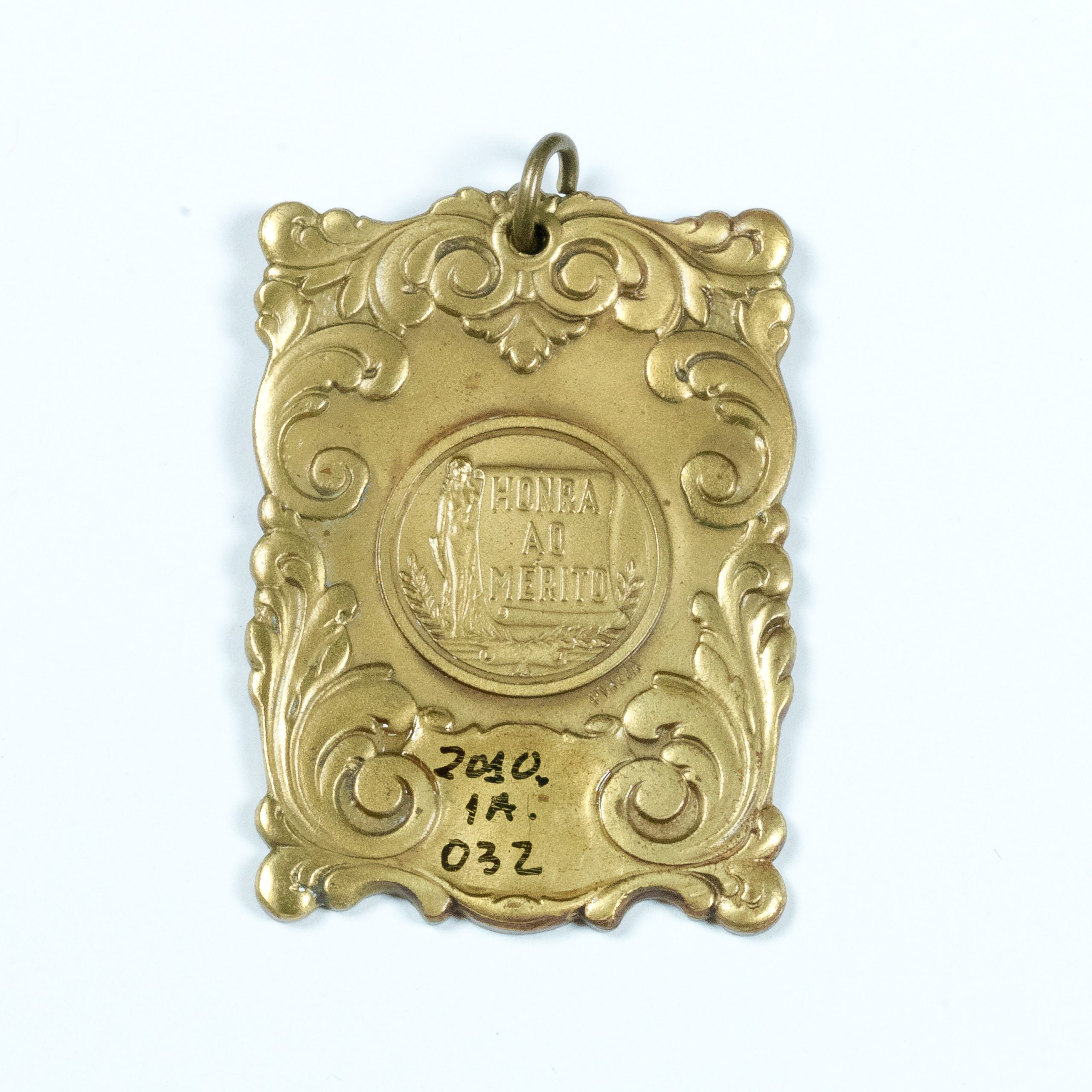 Medalha honra ao mérito, em metal dourado, formato retangular, possui volutas em todo o entorno do anverso. Ao centro a seguinte inscrição: "Honra ao Mérito", um corpo feminino e folhas de louro. Reverso: 1° Concurso Nacional Villa-Lobos VIT. E.S. - 79