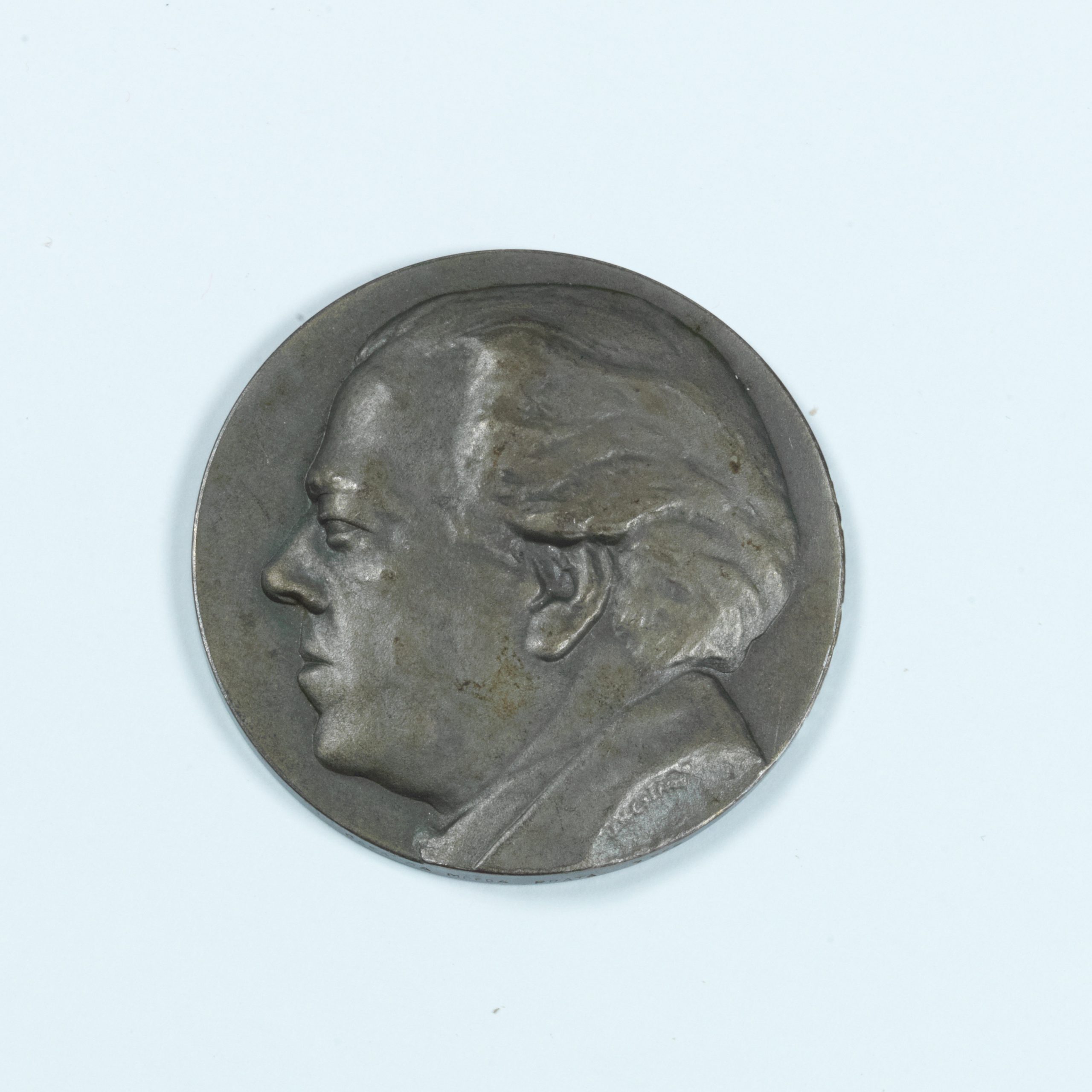 Medalha em bronze com efígie de Villa-Lobos e a inscrição “É na natureza que o homem encontra sua melhor inspiração”. Medalha Comemorativa do 50° aniversário de vida artística de Villa-Lobos, cunhada em Paris