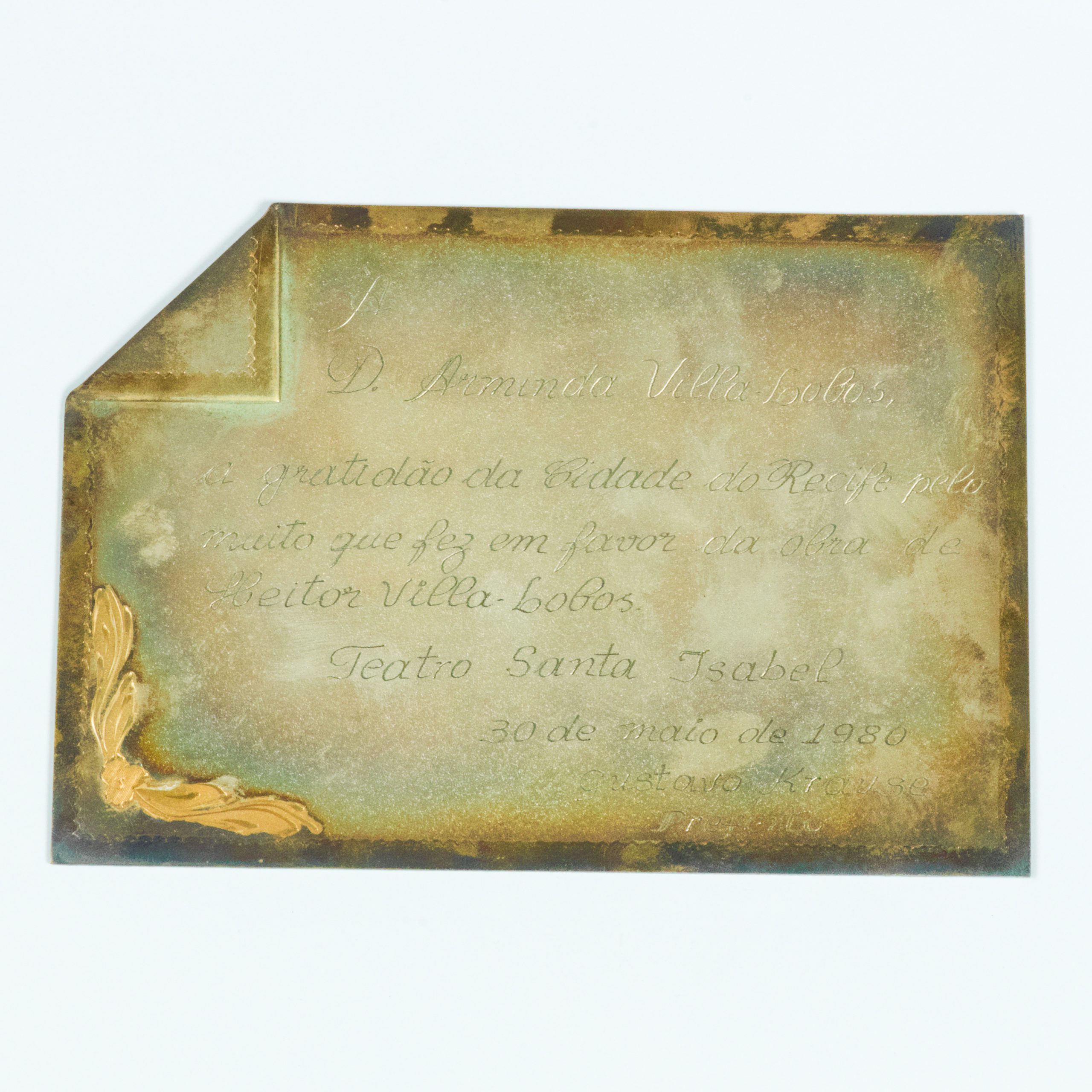 Placa comemorativa29 de novembro de 2023 2010.01B.012 Baixar Número de registro2010.01B.012Outros números76.2.3ETítuloPlaca comemorativaDenominaçãoPlaca comemorativaResumo descritivoPlaca comemorativa dada a D. Arminda, pelo prefeito Gustavo Krause, com a epigrafia: "À D. Arminda Villa Lobos, a gratidão da Cidade do Recife pelo muito que fez em favor da obra de Heitor Villa Lobos. Teatro Santa Isabel" 30/05/1980Classificação10 * INSÍGNIAS E OBJETOS CERIMONIAIS E/OU COMEMORATIVOS > 10.2 ** Objetos Cerimoniais e/ou ComemorativosClassificação MVL01B - Insígnia - Placas comemorativasModo de entradaEmpréstimoEstado de conservaçãoBomCondições de reproduçãoRestritoSituaçãoLocalizadoTipo de itemItem individualColeçãoHomenagens Item anteriorPlaca comemorativa Próximo itemPlaca comemorativa
