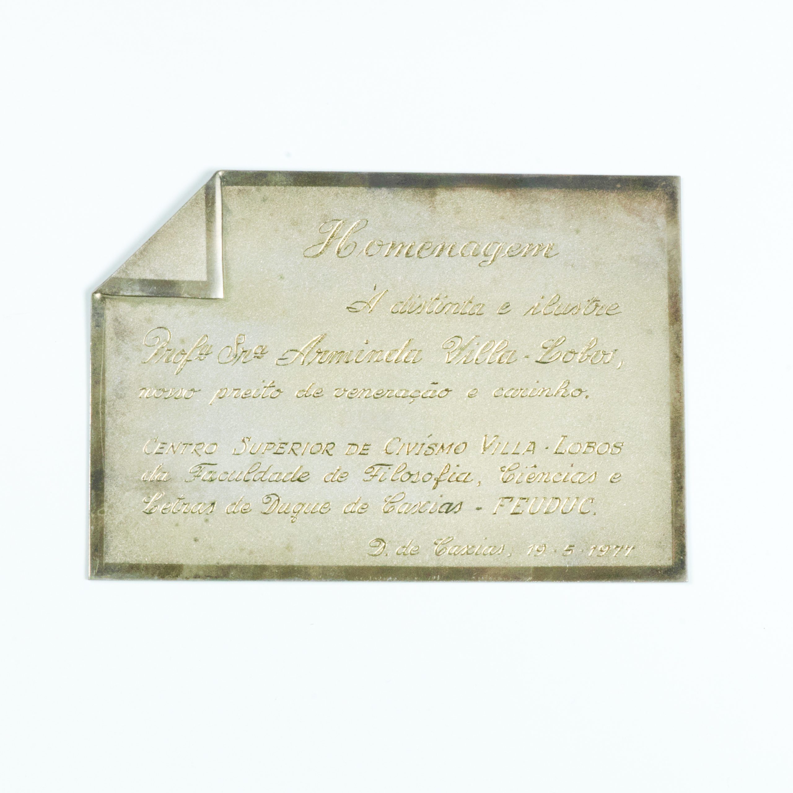 Placa comemorativa Homenagem da Faculdade de Filosofia, Ciências e Letras de Duque de Caxias. Duque de Caxias (RJ), 19/05/1978, em metal prateado, formato retangular com ponta da extremidade superior esquerda dobrada para o anverso. Possui as seguinte inscrições: " Homenagem / À distinta e ilustre / Prof° Sr° Arminda Villa-Lobos, / nosso preito de veneração e carinho / CENTRO SUPERIOR DE CIVISMO VILLA-LOBOS / da faculdade de Filosofia, Ciências e / letras de Duque de Caxias - FEUDUC / Duque de Caxias, 19 - 5 -1977
