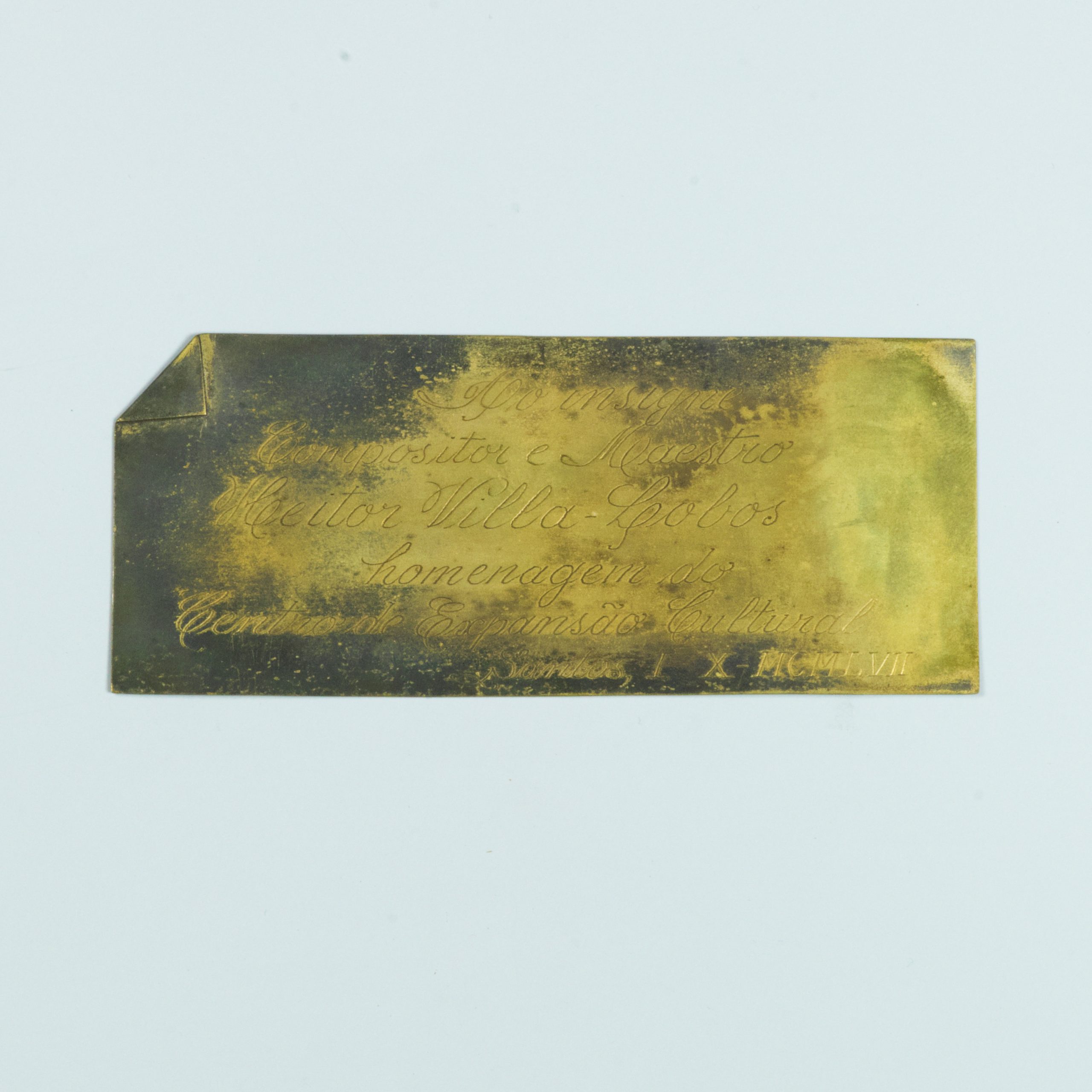 Placa Comemorativa em metal dourado, formato retangular com a ponta da extremidade superior esquerda dobrada. Possui as seguintes inscrições: "Ao insigne / compositor e maestro / Heitor Villa-Lobos / homenagem do / Centro de Expansão Cultural / Santos, I - X - MCMLVII"