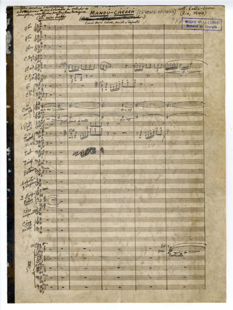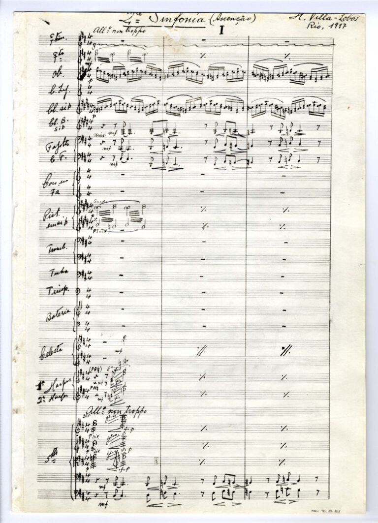 - na 1ª página, no campo superior: "Trio/(Violino, alto e celo)"; à direita: "H. Villa-Lobos/(Rio, 1945)".